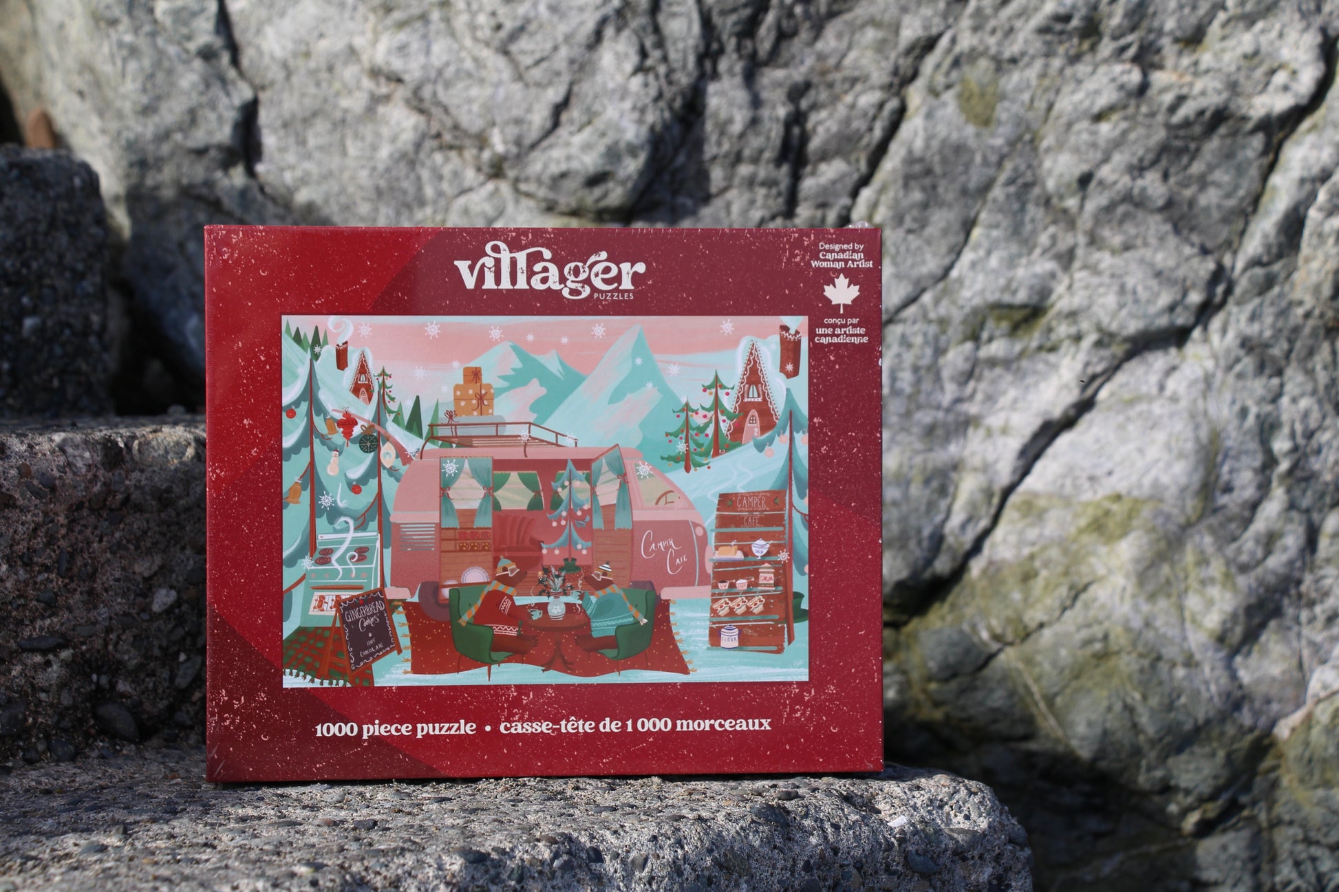 ‘This charming puzzle features a festive camper café nestled in the snowy mountains, where a cozy scene unfolds with gingerbread baking in the oven and cute bears sip hot chocolate. Designed by British Columbia artist Capri Sadler, the artwork captures the whimsy and warmth of the holiday season, blending playful details with a magical mountain backdrop. Perfect for Christmas puzzling, it celebrates comfort, creativity, and the joy of festive traditions.’ Villager Puzzles