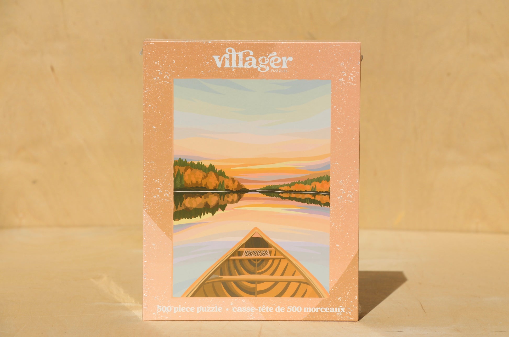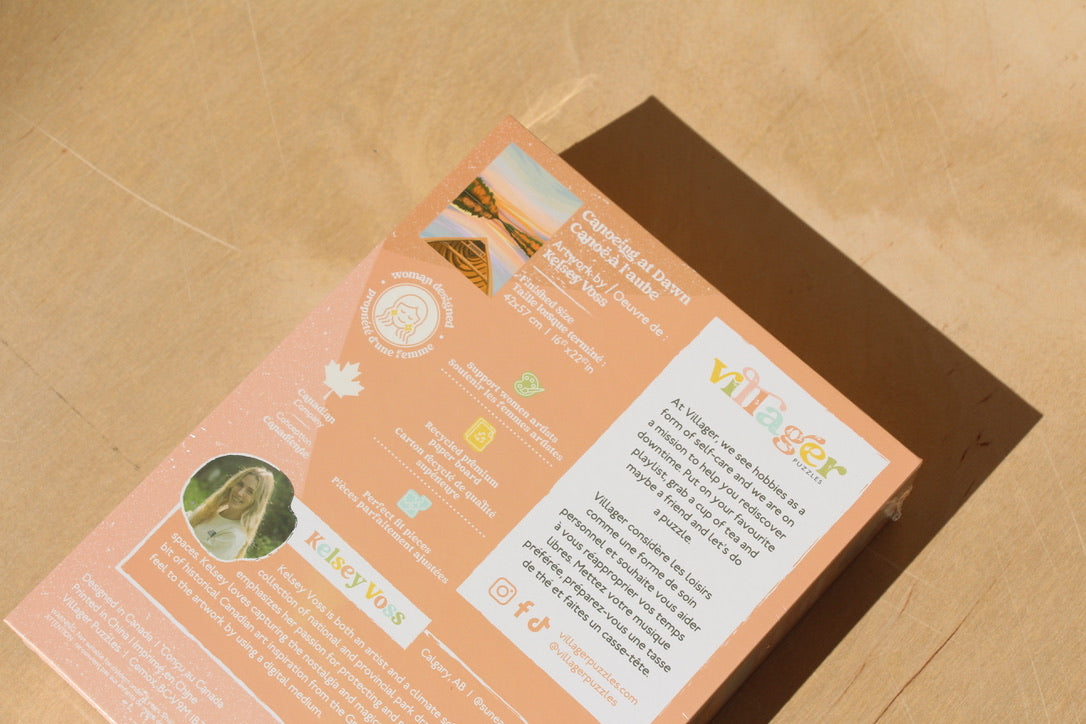 Drift into the calm of an early morning paddle with this peaceful puzzle, featuring a quiet lake scene from Kejimkujik National Park in Nova Scotia. Illustrated by Calgary artist Kelsey Voss, this tranquil moment captures a canoe gliding through still waters, surrounded by autumn trees and a pastel sky. Designed for outdoor lovers, this puzzle brings the serenity of dawn and the beauty of changing seasons to your table, one soothing piece at a time.